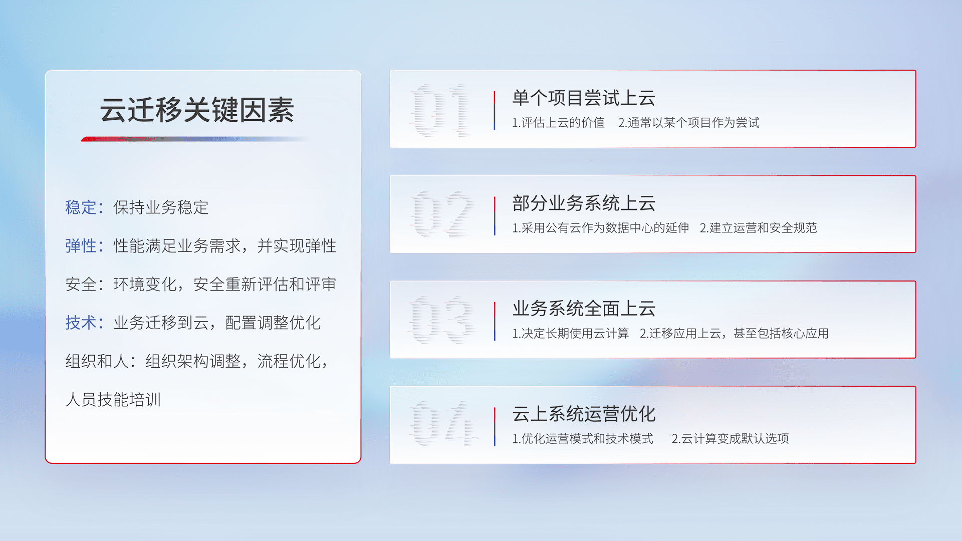 结合实际业务,,,从规划设计、、云平台选型、、、、云原生改造、、、数据迁移、、、、集成交付,,,迁移全过程为客户识别最佳上云路径,,,做好风险识别管理,,,设计网络架构、、、、身份权限、、安全审计合规、、、操作审计、、、日志审计、、、、监控告警策略、、多站点容灾设计等,,对云上基础设施进行整体规划,,提升IT治理水平,,,,以满足弹性、、、高可用、、、、高性能的需求。。。。