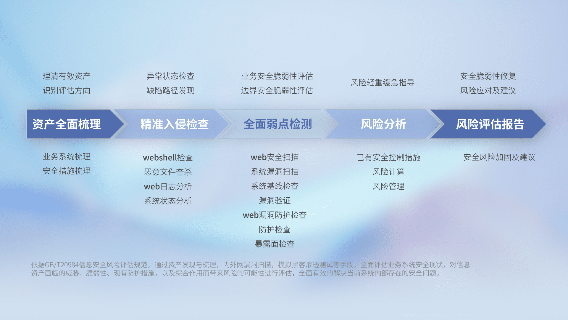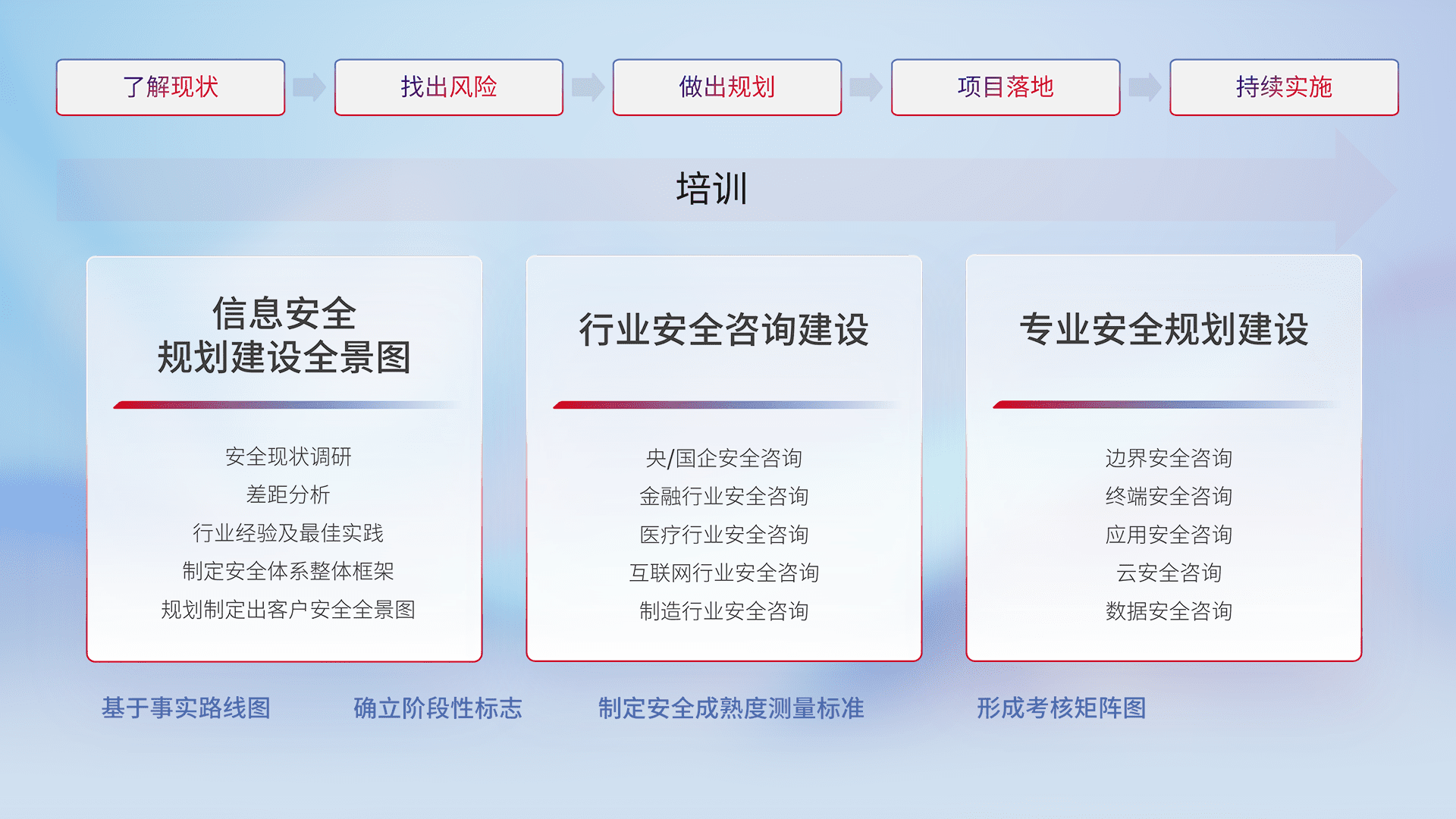 针对客户行业特性,,以专业的安全服务+多厂商联合解决方案提供专属的一站式安全管理服务,,,,帮助客户全面感知网络空间威胁,,基于识别、、、检测、、分析、、防护、、、、监测、、、、响应的服务理论模型,,,,从方案咨询、、、、集成交付、、、评估验证、、、、优化加固、、运维运营,,,致力于为客户提供完整的闭环管理式安全服务。。以实战经验为客户打造高抵御风险的安全体系,,,帮助客户发现威胁、、、、对抗威胁、、、、处置威胁,,,,不断积累安全对抗能力,,,,持续保障数字化安全。。。
